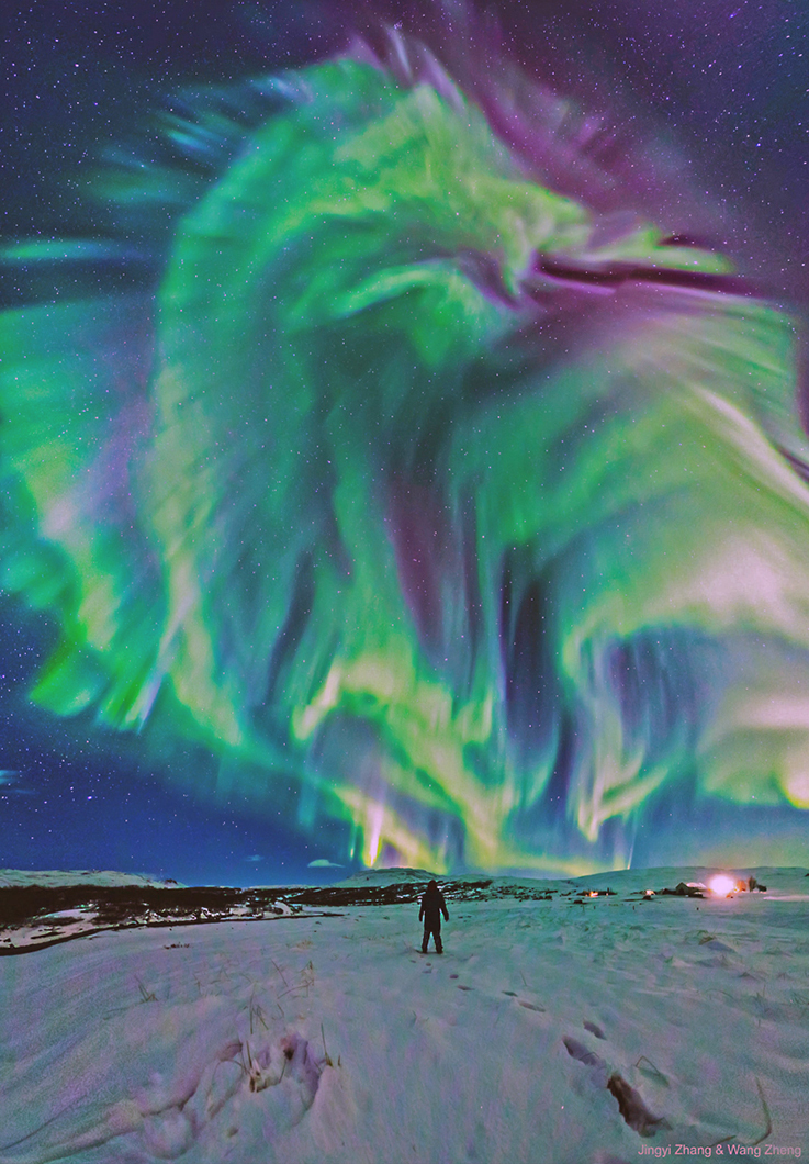 龍年將至,一條「來自」太陽的火龍首先在冰島天空出現。雖然龍是虛構的生物,冰島上空卻真的出現一大片龍形的極光。這例極光的源頭是源自日冕洞的太陽風帶電粒子,順著變化不定的行星際磁場泛流到地球的磁層。而部份的帶電粒子衝撞地球大氣,激發了高層大氣的原子,後來它們發出可見光輻射形成極光。這團奇形的極光是如此的迷人,就連攝影者的母親都跑出來觀賞,並成為影像部份的前景。隨著太陽往二零二五年的活動極大期邁進,其表面不斷出現異常大量的日珥、暗條、太陽黑子和大型活躍區。