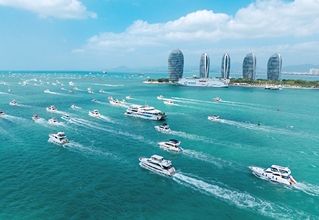 與「夢想」號郵輪相隔不遠的三亞灣海面上,小巧輕便的遊艇與龐大的郵輪相映成趣。眾多遊艇依次出海,行進過程中掀起白色浪花,十分壯觀。