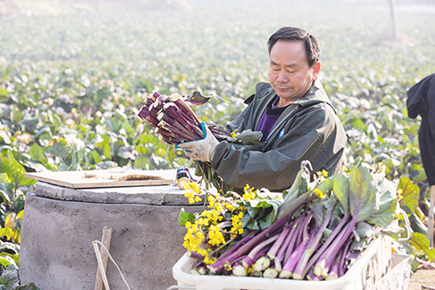 每天清早,趁露水未乾,菜農便穿梭於田壟間,長勢繁茂的菜薹如女子手腕粗細,葉片紅得發紫。菜農手握掐刀,瞄準基部輕輕一掐,汁水四溢,拭塵土、扒外皮,即可生食。若是經歷寒風雪霜,更是甘甜。