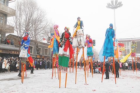 ◎ 二月二十一日,農曆正月十二,青海省西寧市湟中區魯沙爾鎮,社火表演精彩不斷。「楊六郎」「七仙女」「孫悟空」等七十名高蹺演員和五百多名社火演員在降雪天氣中為民眾祝福祈願。被稱為「空中舞蹈」的魯沙爾高蹺起源於明代洪武年間,距今已有六百多年歷史,其蹺身最高的在三點五米以上,以蹺身高、變化豐富、節奏鮮明、韵律高亢而聞名,是當地社火文化的一項重要內容,也是當地老百姓祈求風調雨順、國泰民安的一項傳統的民俗。(中新社記者 馬銘言 攝)