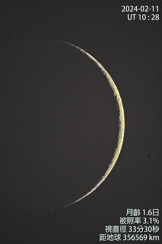 十二月天象 對宇宙是模擬的可能性 物理學家予以排除 彗星「檸檬」的飄逸尾巴 超級月華 立冬後最亮的星雲和雙星團 今年最大滿月 哈伯望遠鏡拍攝的 木星紫外光影像 太陽黑子 龍年第一個鵝眉月 2024-02-26 03:30:00 ◎ Takahashi FC-N 100 F/9 with Celestron 2x Barlow;Canon EOS M50 ISO-250 1/20s;2024-02-11(梓輝)