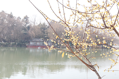 太液池的春天,發自梅花香裏,繞著太液西池的長廊,是盛開的蠟梅,千姿百態的蠟梅花,把西池裝點得十分淡雅:這是幾株老梅,粗黑扭捏的枝丫,向西池傾斜,枝丫上黏著多多蠟梅。陽光穿過蠟梅,成為一隻隻金色的蝴蝶,戀著枝頭,沐著春風,我輕輕一摸,好像就有蠟黃的液體黏手,這春天的使者啊,總把太陽的金光吸足,獻給人間的早春。蠟梅花影,投在池中,池水清藍,黃光點點,白雲洗浴。我拿出相機,對著逆光,把一束七彩陽光、一束蠟梅、兩只蜜蜂,定格在西池之畔。一位童顏鶴髮的老攝影者,用微距對著三朵蠟梅拍攝,他一定把太液西池的春天放大了。那是一簇年輕的蠟梅,發青的枝條,蓬勃向上,黏著開放的、羞澀的花朵,在斜斜的陽光下,或明或滅,閃爍著金光,身邊立著一棵老柳,泛綠、柔潤的枝條,努著密密麻麻的芽苞,恰到好處地垂在這簇蠟梅中間,一簇簇蠟梅花,就是別在柳樹秀髮上的春天,向著大地散發春天的體香。那是三株矮小的蠟梅,立在紅葉石楠中間,與石楠一起守望西池,一片白雲飄過來,暫停在池邊,一起給西池繪製出一幅紅、黃、白、藍的畫卷,晾曬在春陽下。那是一株立在怪石中的蠟梅,大概是春風的柔情,把它的枝條吹得彎彎的,正好圈住了對面的蓬萊山,一條金絲繞蓬萊,半池碧水照藍天。但見蓬萊山,靜臥平池中,野鴨慢慢遊,春煙裊裊升,好一個人間仙境。那是一排排還沒開放的紅梅,枝丫上冒著密密匝匝的紅點,在蠟梅花謝幕的時刻,紅梅將會閃亮登場,紅半個西池。