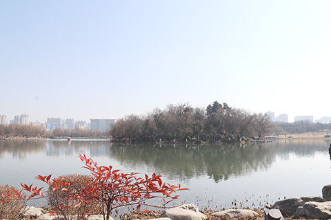 大明宮遺址公園裏有一湖,叫太液池,也叫蓬萊池,是盛唐時期皇家的池苑,分為西池和東池,西池呈橢圓形,池中有蓬萊山。東池呈圓形,兩池相連,成為一枚上天賜給一個大驚嘆號,藍天下,映照太陽、月亮和著八百里秦川煙雨白雲。初春的太液池,落葉樹剛剛打芽,只有常青樹中的勁松、香樟、竹排、紅葉石楠還有或綠或黃或白或紅的葉子,在春風裏顫動,遙響春天的銅鈴。