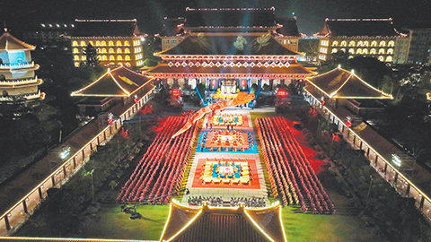 夜幕低垂的成佛大道上祥和寧靜,璀璨的光雕將大雄寶殿映照如同佛光普照,此時天際飛龍盤旋「祥龍獻瑞」,象徵龍天護佑。慧傳法師祝禱大眾諸事吉祥、消災免難、所求滿願、安樂富有。◇