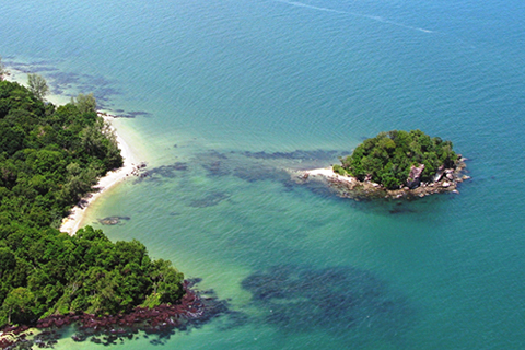 這裡是柬埔寨西哈努克省雲壤國家公園內的金銀灣國際旅遊度假區,原始雨林植被覆蓋率達95%以上,礁岸、淺灘、濕地、緩山類型豐富多樣,海水淨透,景色宜人。