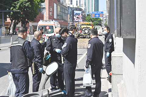 廣州發生一宗車禍十一人受傷 2024-03-13 03:31:00 ◎ 三月十二日,廣州市公安局交通警察支隊通報,二零二四年三月十二日九時許,一輛小汽車先後在廣州市越秀區中山四路、廣仁路與行人和電動自行車發生碰撞,造成十一人受傷。圖為工作人員在中山四路清理事故現場。(中新社記者陳楚紅 攝)