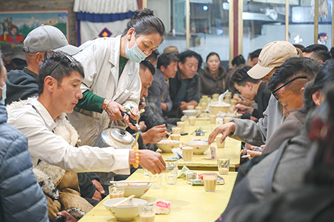 在大昭寺附近,光明港瓊甜茶館座無虛席,到這家老店喝茶、吃藏麵已經成為許多拉薩人的生活方式,服務員穿梭其中,嫻熟地添茶收錢。