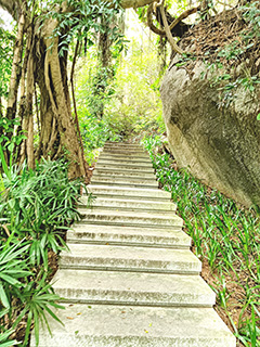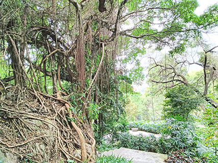 上山頂的路徑,有近十條之多,且都給人一種曲徑通幽之感。彎彎曲曲,看似到了盡頭,等走過去後,卻又有種柳暗花明的味道。僻靜的角落裏,恰到好處的安置有石質的靠椅,或者方桌。路邊最多的,一種叫鴨腳木的常綠灌木,只要剪下其枝條,插到土裏,勤些澆水,就能成活。