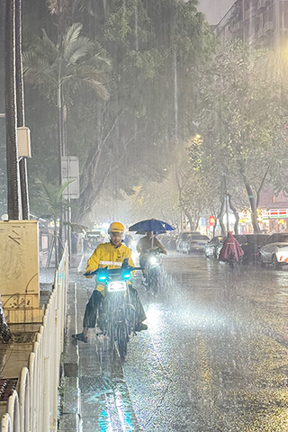 29日晚,記者在廣州市珠江新城看到雨勢很強,雨傘已無法遮擋降雨;部份道路還出現水浸,路上車輛出現緩行。