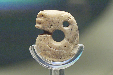 出土于吉林省農安縣左家山遺址的左家山石龍,長四點四厘米、寬三點八厘米、厚一點四厘米,由灰白色霏細岩磨製而成,周身光滑無紋,呈蜷曲狀,首尾銜接如玦,頭部有突起的五官,頸後背脊處有一圓孔,用於穿繩懸掛。
