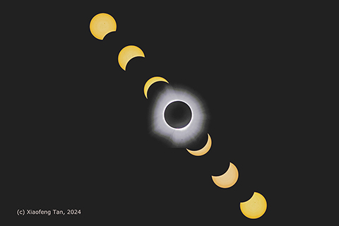 透過起始於左上角的七張清晰序列照片,可以追蹤四月八日的日全食之歷程。這個影像序列,是用配搭望遠鏡的相機,攝於月亮的影子沿著狹窄的全食帶,掃過美國佛蒙特州的新港市之時。最中間的那幅呈現了太陽壯麗的日冕。而太陽的稀薄外層大氣,也只有在日全食的食甚階段才得以用肉眼輕易在清朗幽暗的天空中觀賞。從新港市看出去,此次日食的食甚階段持續了大約三分二十六秒。