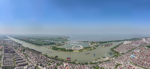◎ 位於揚州高郵市的大運河和高郵湖(無人機全景照片,四月廿六日攝)。(新華社記者 張鋮 攝)