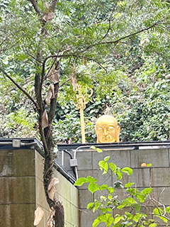 我們走到常寂園的大門前,看到它那道不鏽鋼的門上,寫著常寂園三個字,由於重門深鎖,我們未能內進,只好在外圍遊走。我們從其中一面圍牆的上方,可以看到一個金色的佛像頭從圍牆內冒了出來,那是園內中庭位置樹立的地藏王菩薩,由於佛像有五米高,而且又是整座金色的,所以即使身處牆外,也可以看到手持金剛杖的地藏王菩薩的頭部,也相信在骨灰龕場內建造如此高大的地藏王菩薩,一定與鎮壓場內的亡靈有關。我們在外圍遊走及拍照,稍事逗留便離開,也結束了此次尋園之行。◇(完)