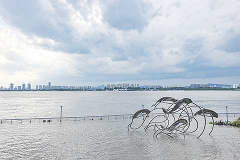 中新社記者4日在長江南京段沿岸看到,長江水位連日來持續上漲,目前已接近江畔公園樹木樹冠的高度。親水步道、臨水平台已被江水淹沒。與長江支流相通的秦淮河水位漲勢更為明顯,一些工作人員正在岸邊巡堤。