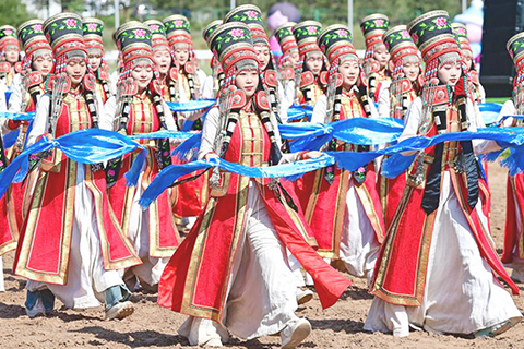 ◎ 七月二十日,演員在開幕式上表演。當日,二0二四鄂爾多斯那達慕群眾體育比賽暨第五屆農牧民健身運動會在內蒙古鄂爾多斯市伊金霍洛旗巴音昌呼格草原開幕。活動以「相約草原.遇見那達慕」為主題,為期三天,除設置了賽馬、搏克等傳統體育項目外,還設置了鄉村大力士、搓玉米棒、快樂插秧等多彩趣味運動,吸引遊客近距離感受草原的魅力,展現農牧民運動風采和幸福生活。(新華社發 王正 攝)