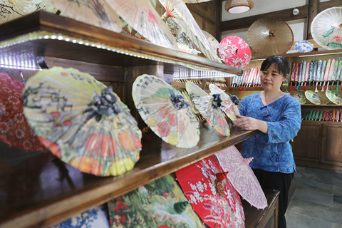 ◎ 七月三日,在江西婺源石門村,銷售特產的村民在整理攤位上的商品。