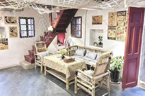 走進外觀具有石厝特色、內部仍然保留著老民居格局的奶茶咖啡館,這裡融入了海島文化,裝飾有麻繩、漁網、畫報、唱片等元素。