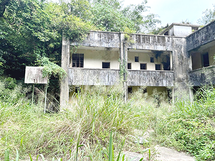 離開九華徑新村之後,我們便順道到在它附近的養正學校一看。養正學校建於1971年,是取代建於九華徑舊村的養正家塾的,學校在1992年結束之後,便一直荒廢至今。我們走了一會,在一處山崗之下,看到一道鐵絲網閘門,友人估計那就是養正學校的後門,於是我們循山路繞了一個圈,果然在雜草叢中發現了養正學校。