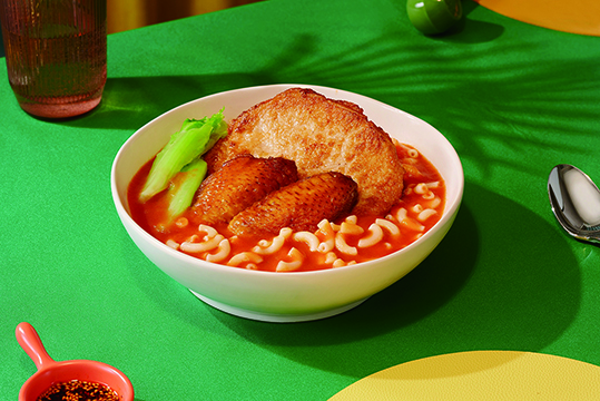 「澳門銀河」店除了有豬扒雞翼番茄湯通粉、豬潤牛肉皮蛋芫茜米線及港式奶茶等,更加入了澳葡特色的獨家菜品:葡式辣腸蛋脆豬和路環蝦醬炸雞錘等。