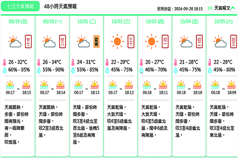 本周二(十月一日)將有東北季風抵達華南沿岸,本澳氣溫將逐漸下降,北風增強;本周中至後期,天色以天晴為主,天氣稍涼並乾燥。◇