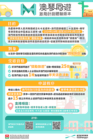 「澳琴同遊激勵計劃」體驗版本於今年十月一日至明年三月三十一日期間接受申請。對象包括在澳門或橫琴依法成立並登記納稅的企業、非盈利組織或澳琴以外依法設立的實體,以主辦、籌辦單位或指定委託單位的名義在澳門或橫琴粵澳深度合作區籌辦「獎勵旅遊」活動。