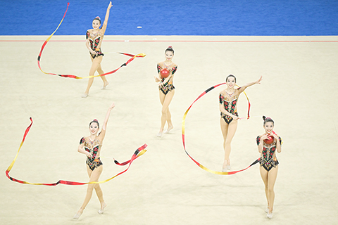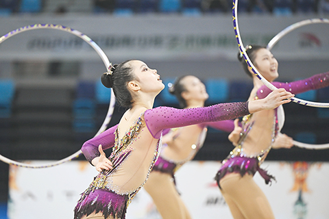 ◎ 十月十九日,二0二四年全國藝術體操冠軍賽、二0二四年全國青少年藝術體操冠軍賽開賽儀式在重慶市沙坪壩區舉行。此次比賽共有二十六支運動隊約三百五十人參賽。運動員們將圍繞成年個人圈、球、棒、帶,成年集體五圈、三帶兩球,少年個人徒手、繩、圈、球、棒、帶,少年集體五繩、五球等項目上展開比拼。圖為參賽選手在成年集體五圈比賽中。(中新社記者 何蓬磊 攝)
