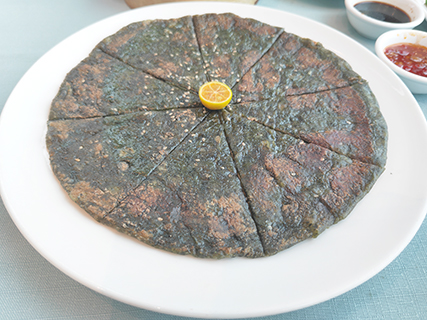 艾香餅被攤成蛋糕的圓形,很薄,採用柳州艾草攪拌壓平加麵粉做成的,上面有許多白芝麻,吃進嘴裡油香油香的。