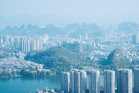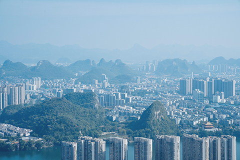 白天在地王大廈雲頂閣,觀柳江和周邊裙樓,遠山雲霧環繞一切,就像中國四大名著的《西遊記》神仙看人間,有不一樣的意境。