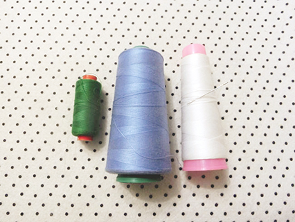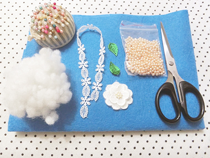 (2)深綠色、白色、藍色線圈各一個,手針一支,剪刀一把,珠針一盒,棉花少許,香檳色小珍珠一包,4cm白色花花一朵,白色花邊少許,綠色膠葉子兩片。