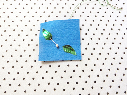 (二)先用珠針將膠葉子片固定在一塊蛋糕布的布面適合位置上,再在葉子上的小孔以斜針的方法縫製。