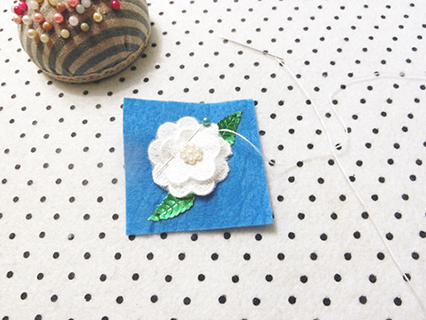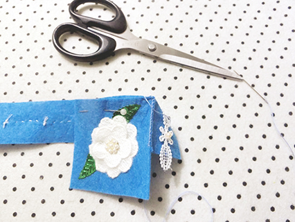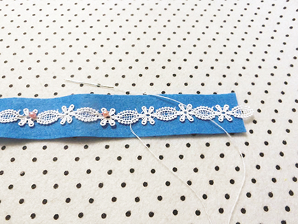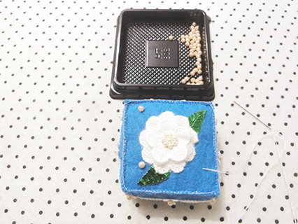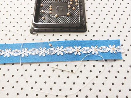 (五)在縫好的花邊布上面的小花中心位置,縫上珍珠。