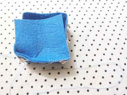 (七)將縫好的蛋糕邊布的左右兩邊布重疊,用珠針固定好後,再以平針的方法縫合,便成正方形的形狀,接著再以鎖針的方法縫上另一塊蛋糕布及塞滿棉花。