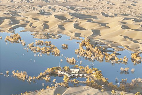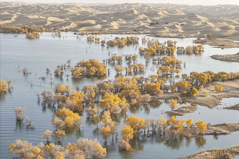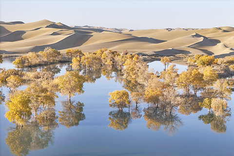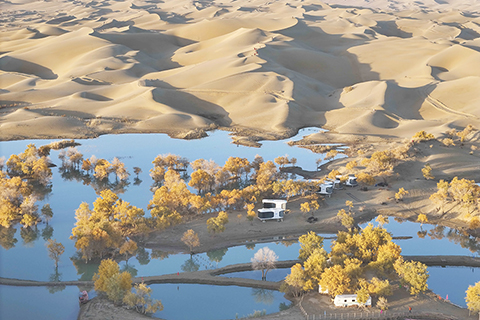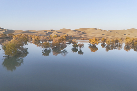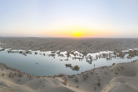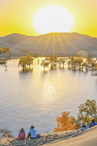台灣圖說 春風送暖 候鳥齊飛 大漠胡楊秋韻 2024-11-20 03:30:00 新疆塔里木河流域分佈著上千萬畝胡楊林,金秋時節,層林盡染。葫蘆島景區地處塔里木河下游、塔克拉瑪干沙漠東緣,這裡集沙漠、湖泊、胡楊於一體,美不勝收,吸引著天南海北的遊客慕名而來。 ◎ 遊客在新疆葫蘆島景區欣賞大漠日出(十月二十六日攝)。(新華社記者 胡虎虎 攝)
