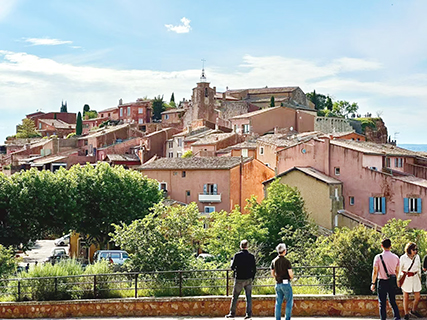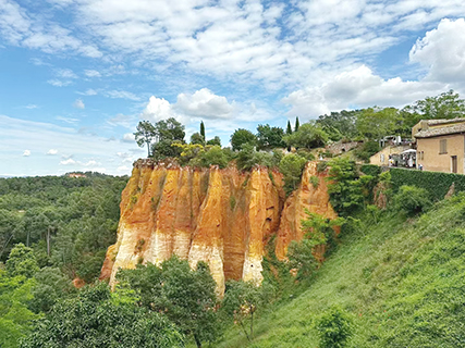 我們當天下午的最後遊覽地是紅土城。魯西永(Roussillon),意譯為紅土城,顧名思義,小城是紅土建造的,土壤中的赭石顏色有黃、橙、紅等多種變化,讓這裡的土地和房屋都呈現出一種奇異的紅色,遠遠看去像是一座建在紅色山崖上的紅色要塞,和美國的羚羊峽谷有異曲同工之妙。這裡曾是歐洲最大的顏料生產地,在這裡還能買到頂級礦藏所製的顏料,是繪畫藝術家的珍藏。