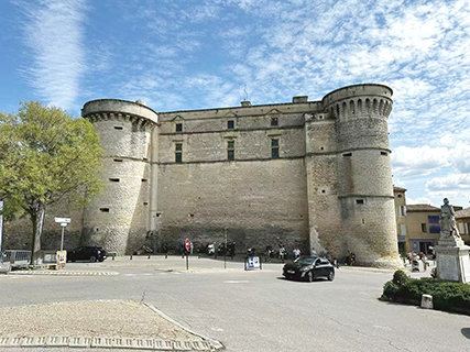高處的城堡和教堂,灰瓦白牆的房子和村舍,如梯狀層層下降,從山頂到山腳,層層疊疊,錯落有致。小廣場上戈爾德城堡灰色的巨牆,這座文藝復興時期建造的石頭古堡靜靜矗立著。歐普OP藝術的創始人瓦薩雷利(Victor Vasarely)買下這個古老的城堡,1970年啟用,他的畫作和雕塑成為城堡藝術館的重要藏品。