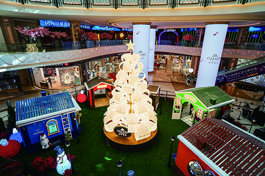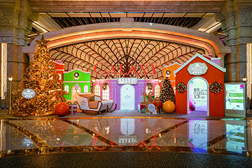 明珠大堂的「喜悅小鎮」掛滿裝飾的巨型聖誕樹下,五座色彩繽紛的小屋彷彿散布於森林綠野中,猶如置身歐陸小鎮。