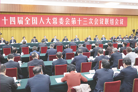 【新華社北京十二月廿四日電】十四屆全國人大常委會第十三次會議廿四日上午在北京人民大會堂舉行聯組會議,審議全國人大常委會執法檢查組關於檢查黃河保護法實施情況的報告並開展專題詢問。趙樂際委員長出席會議。