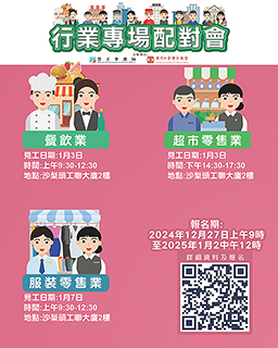 一月七日上午舉辦服裝零售業配對會,提供二十個職位空缺,涉及店長、店務員及倉務員。