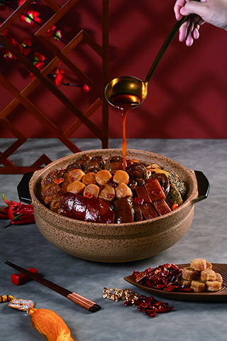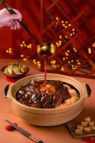 「澳門銀河」呈獻兩款寓意「盆滿砵滿」的賀年盆菜,中華百味盆菜巧妙結合「澳門銀河」九大中餐廳的招牌佳餚,包括北京果木烤鴨、順德藕餅、潮汕發財卷及麻辣豬尾等搭配花椒川辣醬汁,亦象徵紅火興旺的新年祝福。圍村情懷盆菜則傳承香港元朗圍村傳統盆菜製作,頂層滿載鮑魚、髮菜、生曬蠔豉、瑤柱等寓意財富與繁榮;底層則襯以白切雞、燜豬肉、枝竹、蘿蔔等,寄託闔家幸福、福祿盈門的美好祈願。除此之外,「澳門百老匯」匯食坊推出澳門賀年豐味盆菜,選用多達十六種食材,寓意新年豐盛。