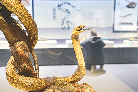 ◎ 一月十四日,「靈蛇獻瑞──二0二五乙巳蛇年生肖文物大聯展」在位於北京的國家自然博物館開展。此次生肖文物大聯展,國家自然博物館精選蛇類標本近五十件,全面展示蛇類的獨特魅力。圖為展覽展出的眼鏡王蛇標本。(中新社記者田雨昊 攝)