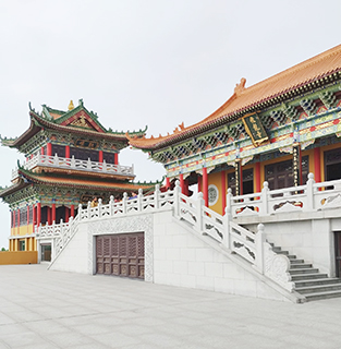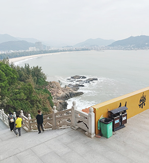 翌日上午,團隊在度假村內享用完自助早餐之後,便乘車前往參觀一所藏在懸崖上的寺廟──飛龍寺。飛龍寺位於陽江市東平鎮玉豚山的半山腰上,總面積有20萬平方米,由於三面環海,又居高臨下,故擁有獨一無二的山海景觀,在寺院的觀景台上,懸崖下三公里長月牙形的珍珠灣美景,可以盡收眼底。當駐足於景致開揚的觀景台上,極目遠眺,依稀還可以看到有大小葛洲島的輪廓,海面上波光粼粼,海天一色;懸崖下的海浪不斷拍打著岸邊的礁石,一次又一次的掀起白色的浪花;海風徐來,讓人為之心曠神怡。如果時間許可,能於此地消磨永日,聽濤觀海,一定十分寫意!相信無論是觀日出,看日落,或遇山雨濛濛,煙波浩渺,孤帆遠景,一定是美不勝收,讓人陶醉於當下。