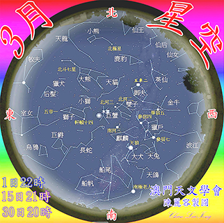 木星東方照時間為3月3日2點,亮度-2.3 等,直徑39.74"。海王星合水星時間為3月3日14點。(南 2.17°)水星東大距時間為3月8日14點。(亮度-0.4等,距角18.2°)土星合時間為3月12日18點。水星留時間為3月15日4點。海王星合時間為3月20日7點。金星內合時間為3月23日9點。水星內合時間為3月25日3點。海王星合水星時間為3月28日10點。(南4.18°)(建燁)◇