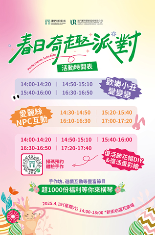 活動還設有象徵春天新生命開端及萬物甦醒的超大型復活節兔打卡裝置,以及多個遊戲攤位,參加者集章後隨時可贏取精美禮品。澳門新街坊特別安排了多場生動有趣的節目,包括小丑魔術雜技表演、童話變裝人物巡遊,與參加者合影互動。