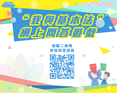 【特訊】為紀念《澳門特別行政區基本法》頒佈三十二周年,澳門基本法推廣協會、法務局、市政署和教育及青年發展局於2025年6月3日至6月30日期間合辦「『我與基本法』網上問答遊戲」,加深市民對《澳門基本法》的認識。問答遊戲分為學校組及公眾組,各為期14日,歡迎市民踴躍參加。