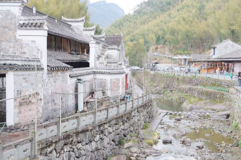 從奉化溪口鎮向西駛入四明山區,不過半小時車程,棲霞坑村便出現在雲霧繚繞處。溪水穿村而過,兩岸青磚黛瓦的古民居錯落有致,與遠處山間翠竹交織,宛若一幅水墨畫卷。