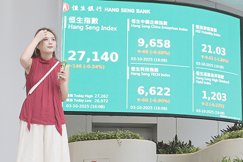 【香港中通社10月3日電】(記者徐嘉儀)港股連升3天後出現回吐壓力,恆生指數3日收市報27140點,跌146點。大市成交額縮至1347億港元。全周計,恆指累升1012點,以點數計是3月初以來表現最好的一周。