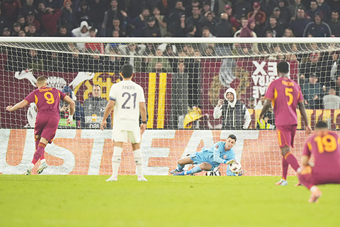 【美聯社十月三日歐洲電】羅馬隊三次射失可以扳平比分的點球,些路迪隊在VAR判罰「令人費解」後扳平比分,諾定咸森林隊在週四歐霸盃賽中慘敗後,在安吉.波斯特科格魯的帶領下仍然未嘗一勝。
