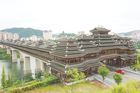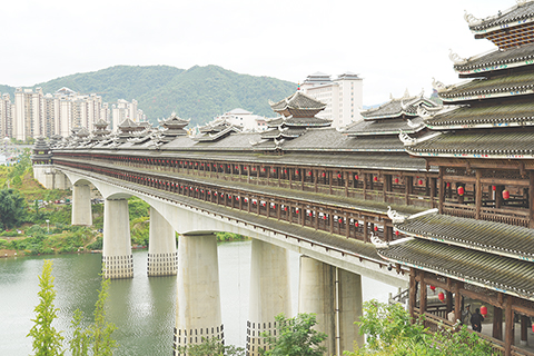 侗族風雨橋是侗族木構建築的代表之一。廣西柳州市三江侗族自治縣現有侗族風雨橋二百餘座,如三江宜陽風雨橋、程陽永濟橋等。(新華社記者 張楓 攝)