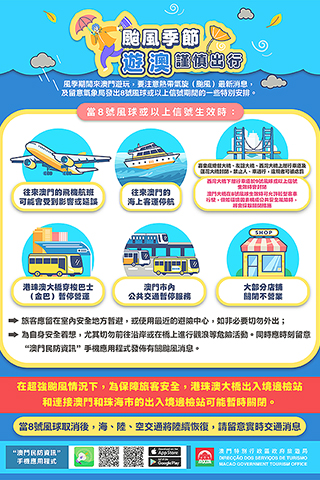 同時旅遊局會因應天氣變化,透過旅遊業界重要資訊通報機制,即時提醒旅客留意天氣、出行和航班等情況,以便協助旅客適時調整行程,儘量減低颱風對旅客的影響。