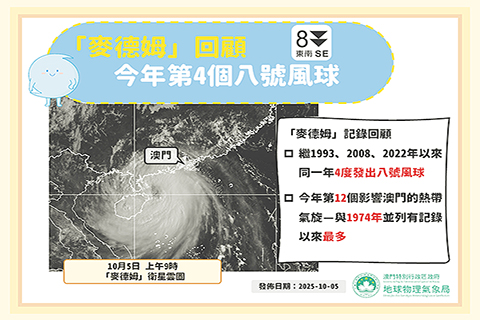 「麥德姆」為本年第十二個影響本澳的熱帶氣旋,與一九七四年並列為有記錄以來發出最多熱帶氣旋信號的年份;同時亦是繼一九九三、二00八、二0二二年以來,再度於同一年內需要四度發出八號風球。